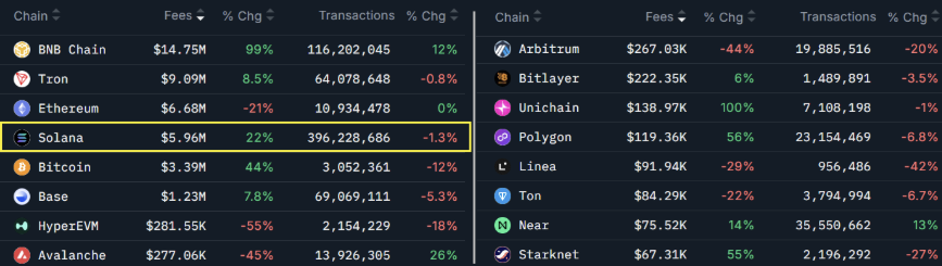 Trong 7 ngày qua, phí mạng Solana tăng 22%, chủ yếu nhờ sự sôi động của các sàn giao dịch phi tập trung (DEX). Trong khi đó, doanh thu mạng Ethereum lại giảm 21% cùng kỳ.