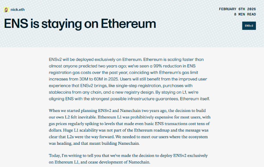 Trong một thông báo đầy bất ngờ vào cuối tuần qua, Ethereum Name Service (ENS) – gã khổng lồ định danh on-chain – đã tuyên bố hủy bỏ kế hoạch phát triển Layer-2 riêng mang tên Namechain. Thay vào đó, dự án sẽ triển khai bản nâng cấp quan trọng ENSv2 trực tiếp trên lớp nền tảng của Ethereum.