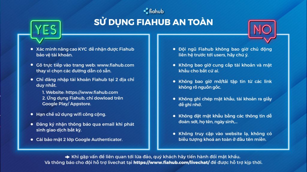 • Fiahub không bao giờ yêu cầu chuyển tiền, nạp tiền vào số tài khoản nào để nhận thưởng hoặc lợi nhuận.