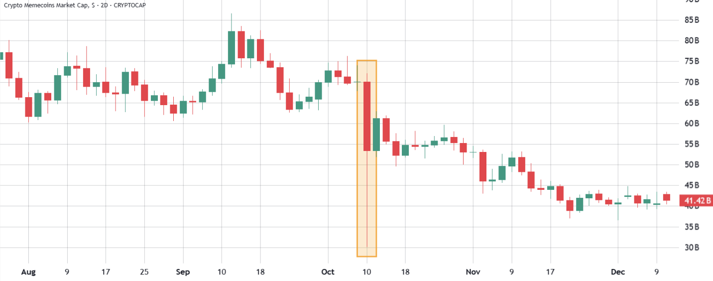 Đà giảm của memecoin diễn ra rõ rệt sau cú flash crash ngày 10/10, sự kiện khiến thị trường crypto chứng kiến 19 tỷ USD bị thanh lý. Biến động này đã phơi bày những rủi ro liên quan đến đòn bẩy cao và thanh khoản mỏng của các altcoin nhỏ, khiến nhà đầu tư trở nên thận trọng hơn với các nền tảng DEX và các token mang tính đầu cơ cao.