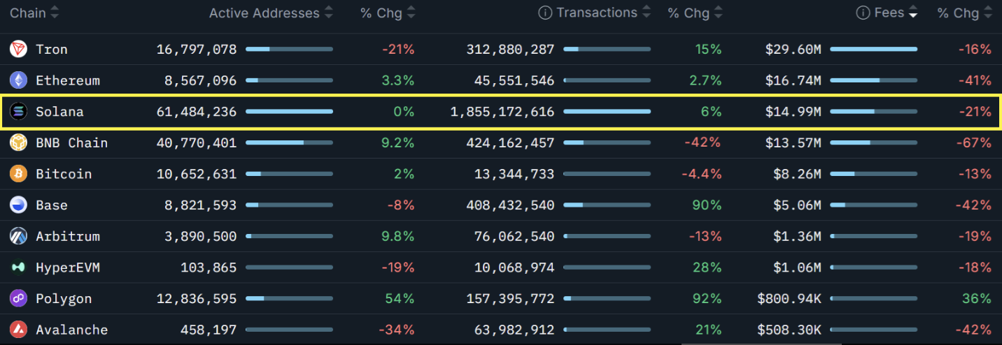 Trong vòng 30 ngày qua, phí giao dịch trên Solana giảm 21%, nhưng mức giảm này vẫn thấp hơn so với nhiều blockchain lớn khác. Cụ thể, BNB Chain ghi nhận mức giảm 67%, trong khi Ethereum giảm 41%, theo dữ liệu từ Nansen. Đáng chú ý, số lượng giao dịch trên Solana vẫn tăng 6%, trái ngược với mức giảm 42% trên BNB Chain, cho thấy mạng lưới vẫn giữ được mức độ hoạt động nhất định.