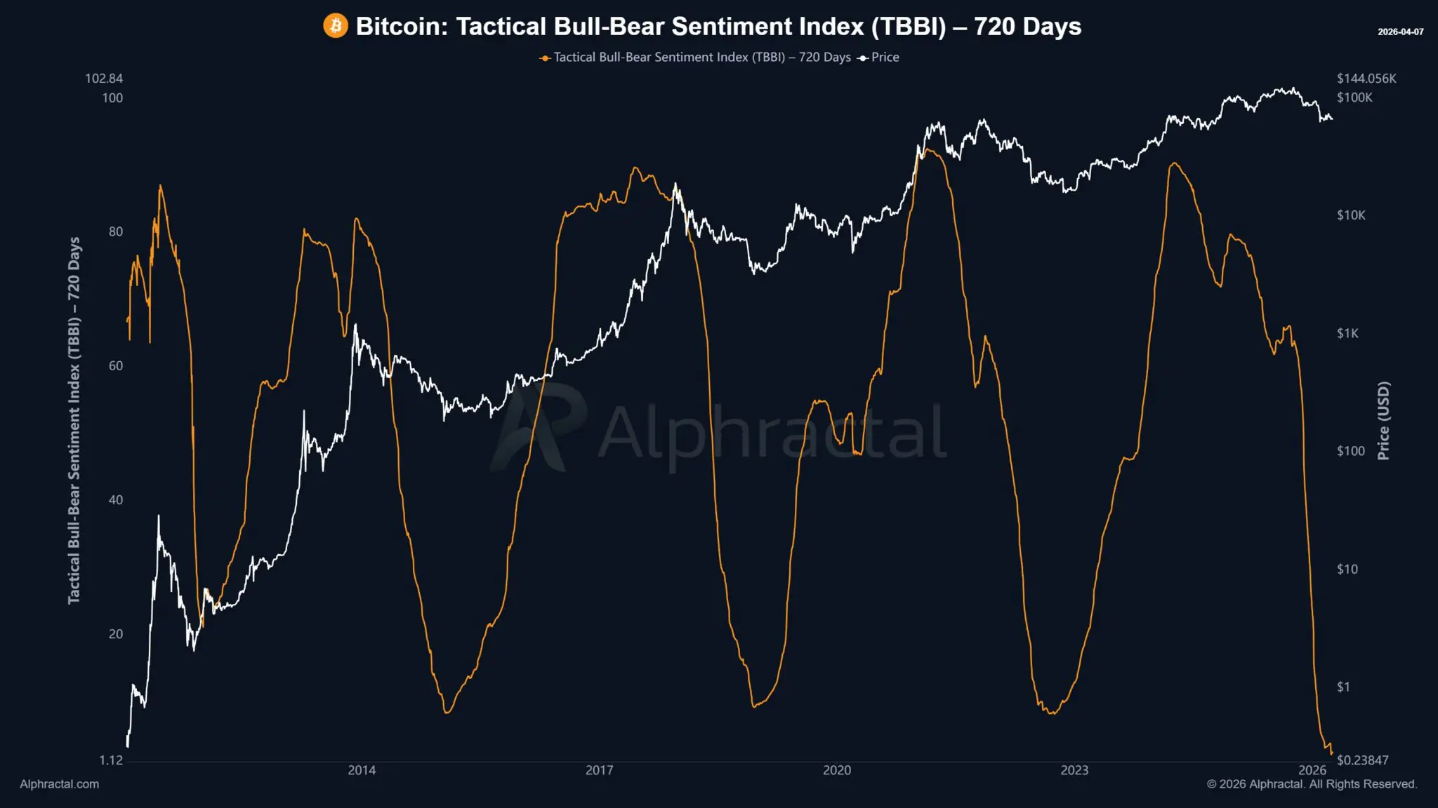Bất chấp các tiêu đề u ám, một số nhà phân tích lại nhìn thấy tín hiệu tích cực từ cấu trúc thị trường. Joao Wedson từ Alphractal cho biết Chỉ số Tâm lý Bò-Gấu (TBBI) 720 ngày của Bitcoin đã rơi vào vùng cực kỳ bi quan.