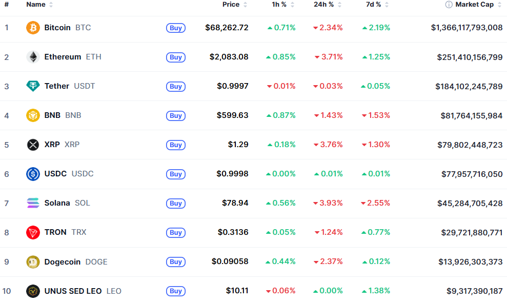 Bitcoin: Đang giao dịch quanh mức 68.154 USD, giảm 2,52% trong 24 giờ qua. Dù hiệu suất 7 ngày vẫn dương nhẹ (+0,39%), nhưng hầu hết thiệt hại đều tập trung vào hai ngày qua khi tình hình Iran xấu đi.