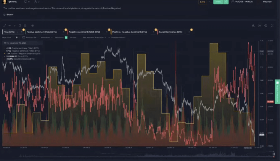 Trái với kỳ vọng đáy, tâm lý thị trường đối với Bitcoin lại xấu đi rõ rệt. Tỷ lệ bình luận tích cực về BTC đã giảm xuống mức thấp nhất trong hơn một tháng, trong khi sự thống trị trên truyền thông xã hội của Bitcoin tăng vọt lên hơn 40% – dấu hiệu cho thấy thị trường đang chìm trong nỗi sợ hãi.