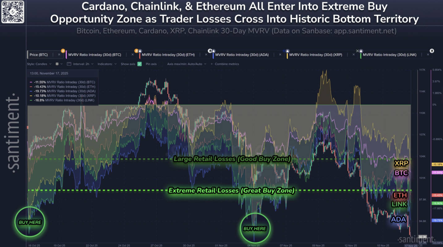 So với các tài sản khác như LINK, ETH hay XRP – vốn cũng ghi nhận mức giảm hai chữ số – ADA vẫn là một trong những đồng giảm mạnh nhất. Bitcoin cũng đi xuống, nhưng vẫn còn trong “good buy zone”, nhẹ hơn nhiều so với ADA.