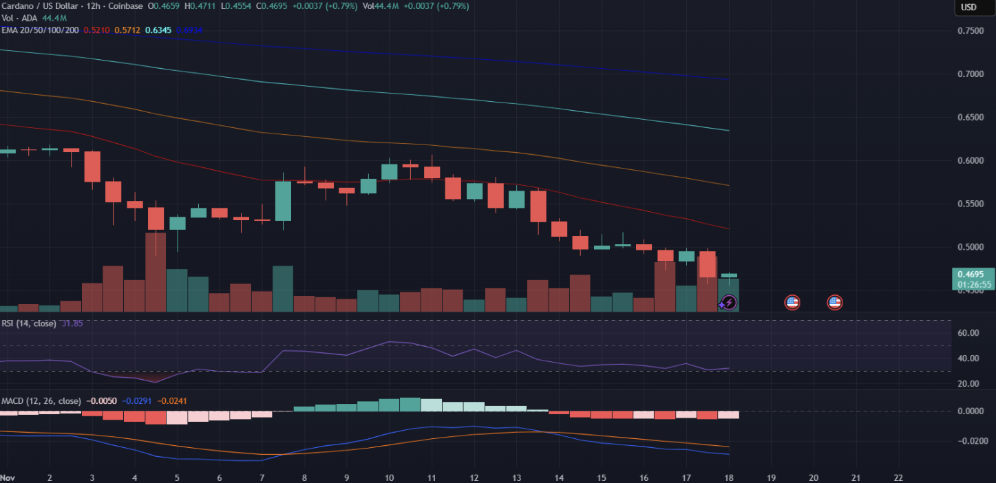 Tại thời điểm bài viết, ADA được giao dịch quanh 0,46 USD, với chuỗi nến đỏ kéo dài. Tất cả các đường EMA quan trọng đều nằm cao hơn giá hiện tại, phản ánh xu hướng giảm rõ rệt.