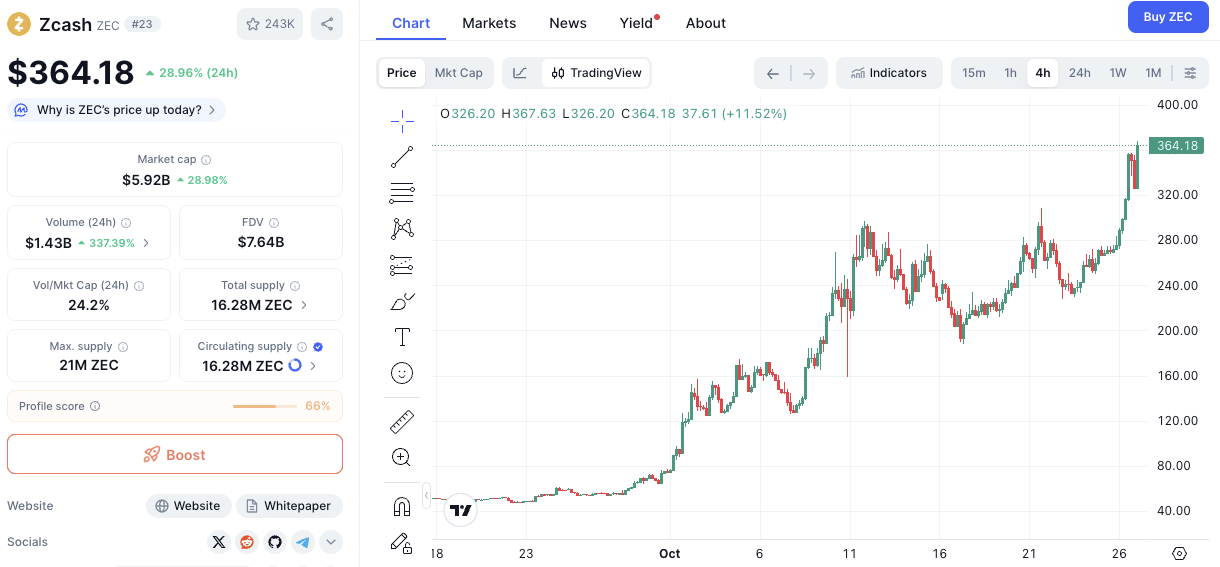 Đáng chú ý, sự bùng nổ của ZEC cũng trùng hợp với bài đăng “vibe check” trên X của Arthur Hayes, đồng sáng lập sàn giao dịch BitMEX, người dự đoán giá ZEC có thể đạt tới 10.000 USD. Ngay sau đó, giá Zcash đã tăng hơn 30% trong 24 giờ, từ 272 USD lên 355 USD – mức cao nhất kể từ năm 2021 – khiến các nhà đầu tư FOMO.